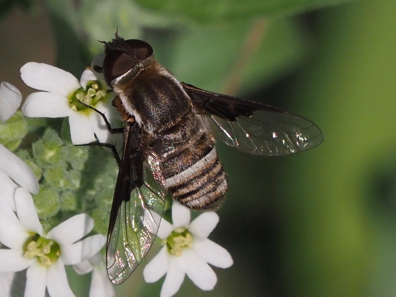 Fliegen (Diptera Brachycera) Familien Artenliste Fotos der Art - 04720 - Diptera Brachycera Bombyliidae Wollschweber, Hummelschweber Exhyalanthrax afer (Fabricius, 1794) Imagines Schönower Heide (BAR), 11.07.2021 Dr. H. Wöhrl   S. Marotzke