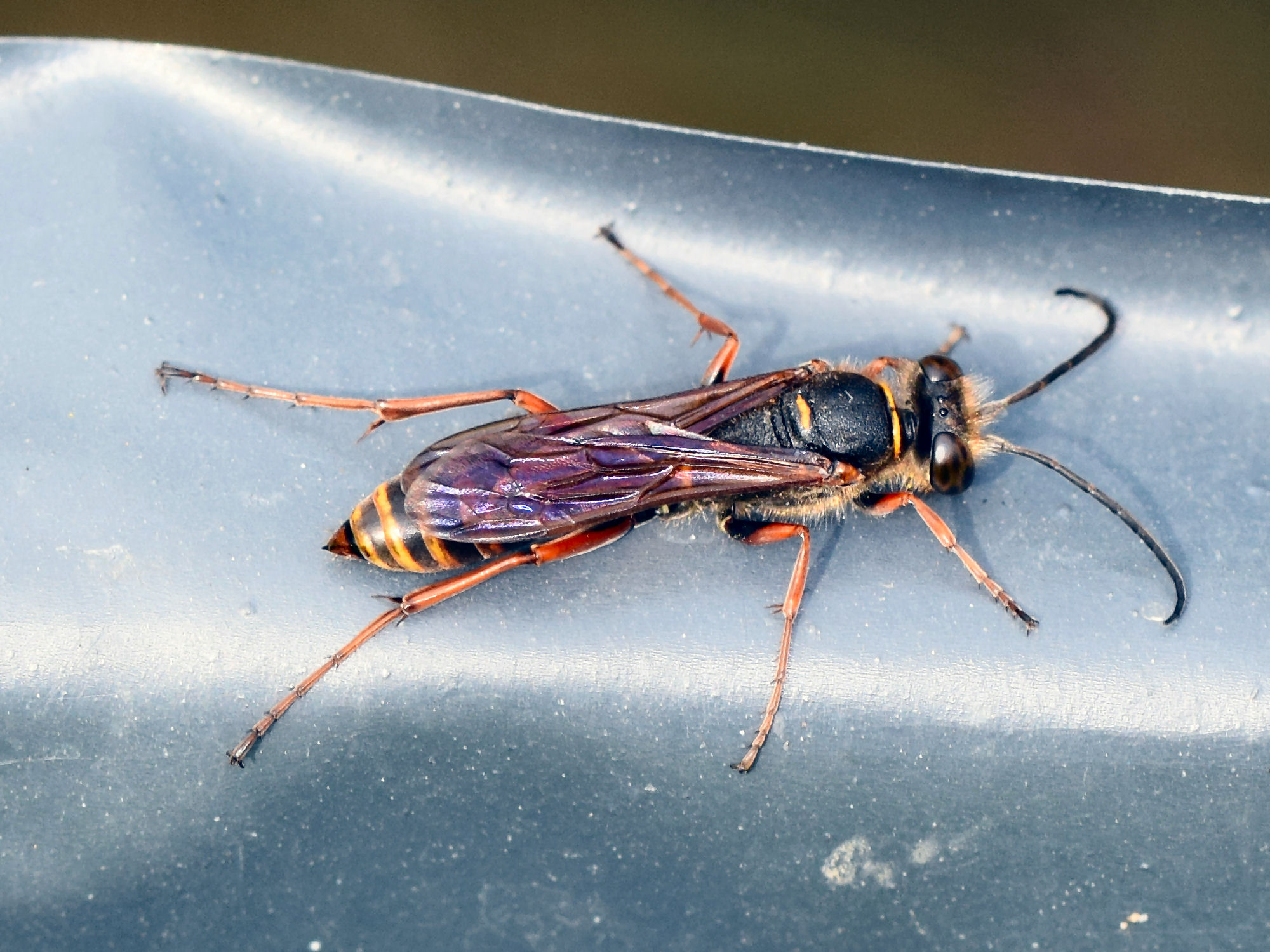 Hymenoptera (Hautflügler) Stechimmen Familien Checkliste Fotos der Art - 10660 - Stechimmen Spheciformes Grabwespen Sceliphron curvatum (F. Smith, 1870) Orientalische MörtelwespeRote Liste Deutschland 2011: nicht gefährdet Imagines Weißensee (BE), 02.08.2015 F. Hesse Weißensee (BE), 24.08.2020 F. Hesse